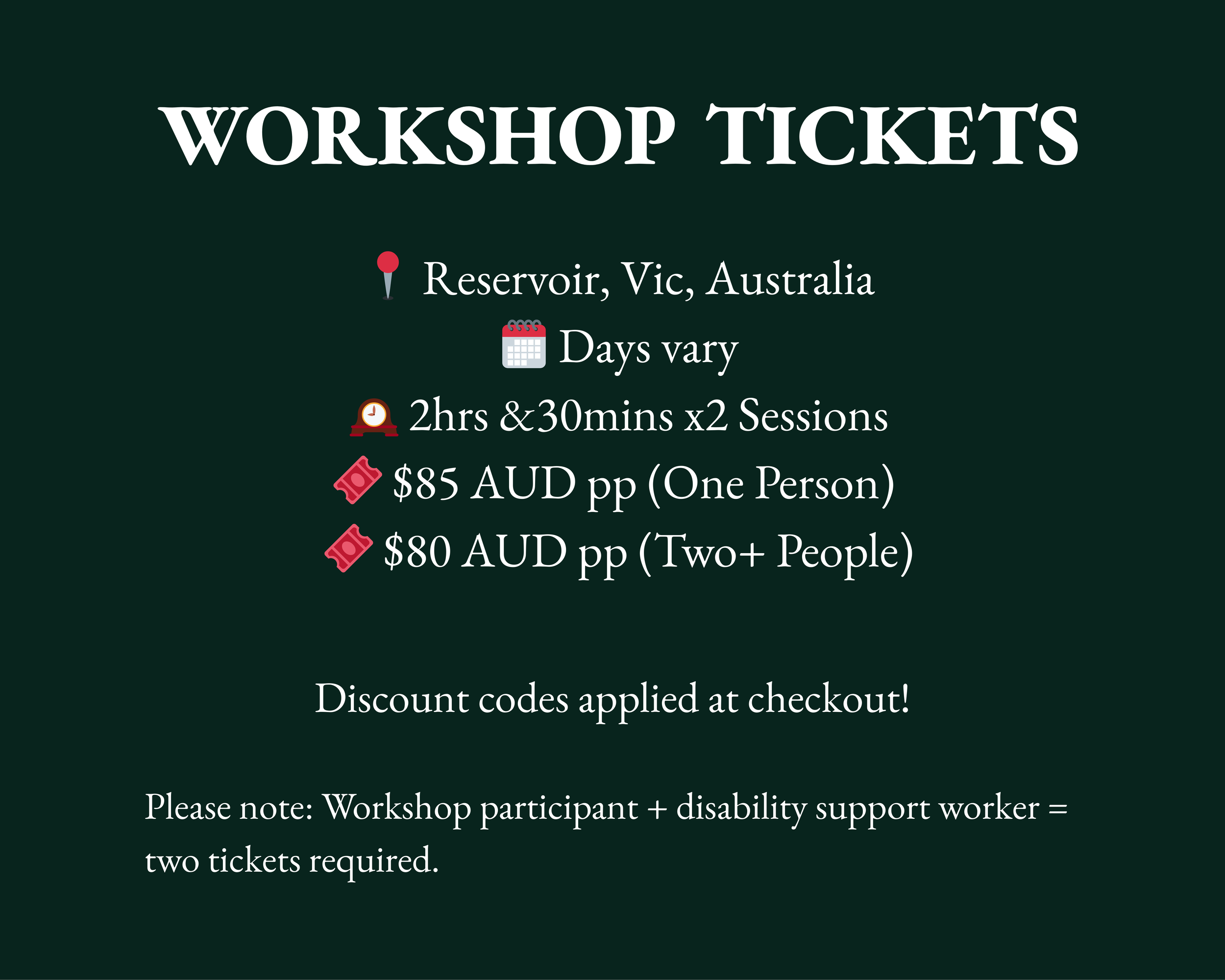 📍 Reservoir, Vic, Australia 🗓️ Days vary 🕰️ 2hrs &30mins x2 Sessions 🎟️ $80-$85 AUD pp
